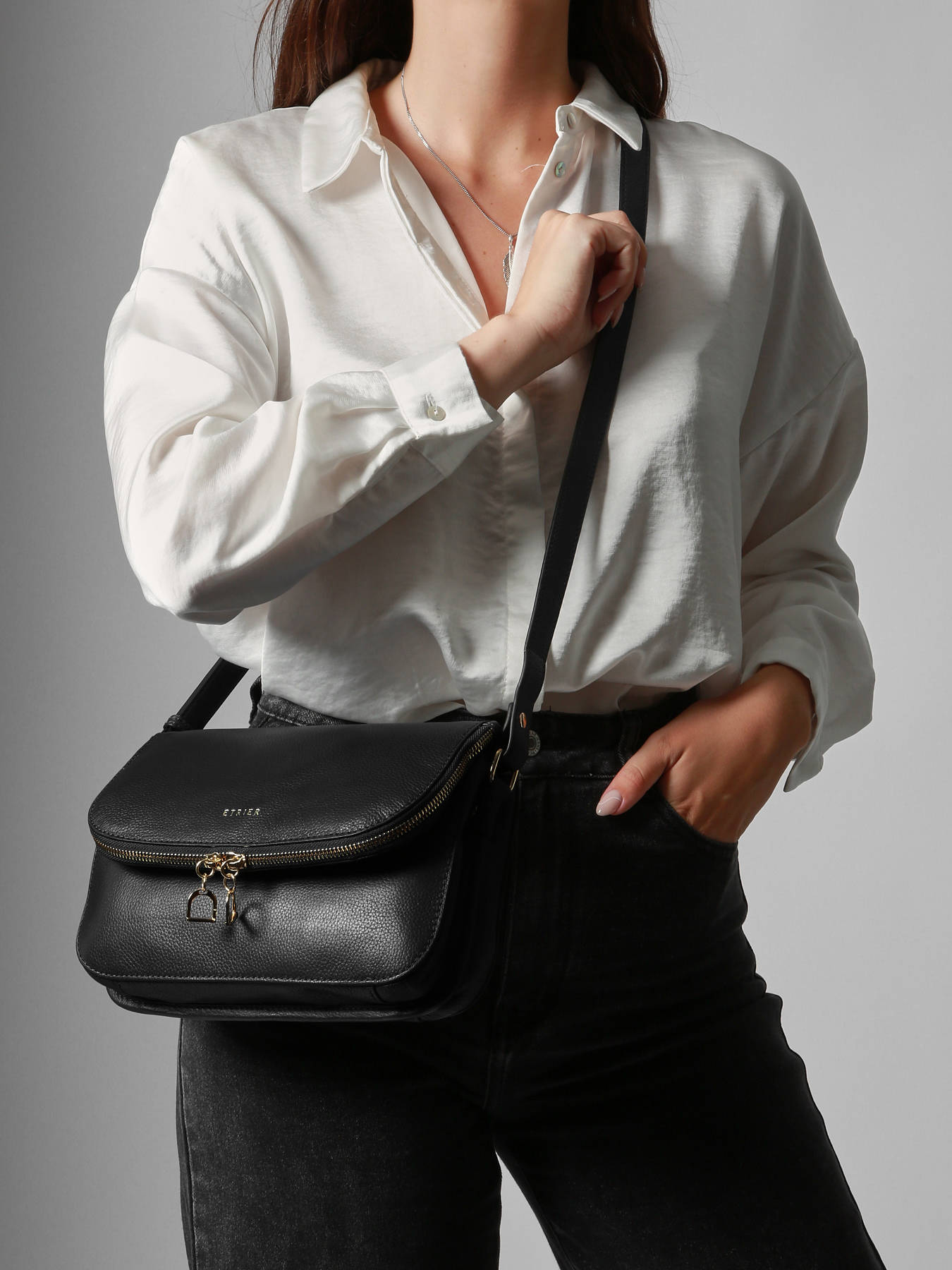 De iconische Tradition collectie van het Franse merk Etrier krijgt dit seizoen een nieuwe look. De tas krijgt een meer hedendaagse uitstraling, zonder de sierstiksels van voorheen. Het resultaat? Een light design, waarin de uitzonderlijke kwaliteit van het soepele leder in de spotlight komt te staan. De light gold hardware, zoals de ritssluiting en het Etrier-logo, bezorgen de tas een vrouwelijke en exclusieve touch. En laat je vooral verleiden door de charmante Etrier-ritshangertjes, in de vorm van stijgbeugels. Deze zijn een knipoog naar het logo van het merk, en dansen vrolijk mee op het ritme van je stappen. Dit mediumgrote formaat is praktisch ingedeeld, en biedt voldoende ruimte voor al jouw dagelijkse essentials. De schouderriem is verstelbaar, en kan gekruist of lang over de schouder gedragen worden.