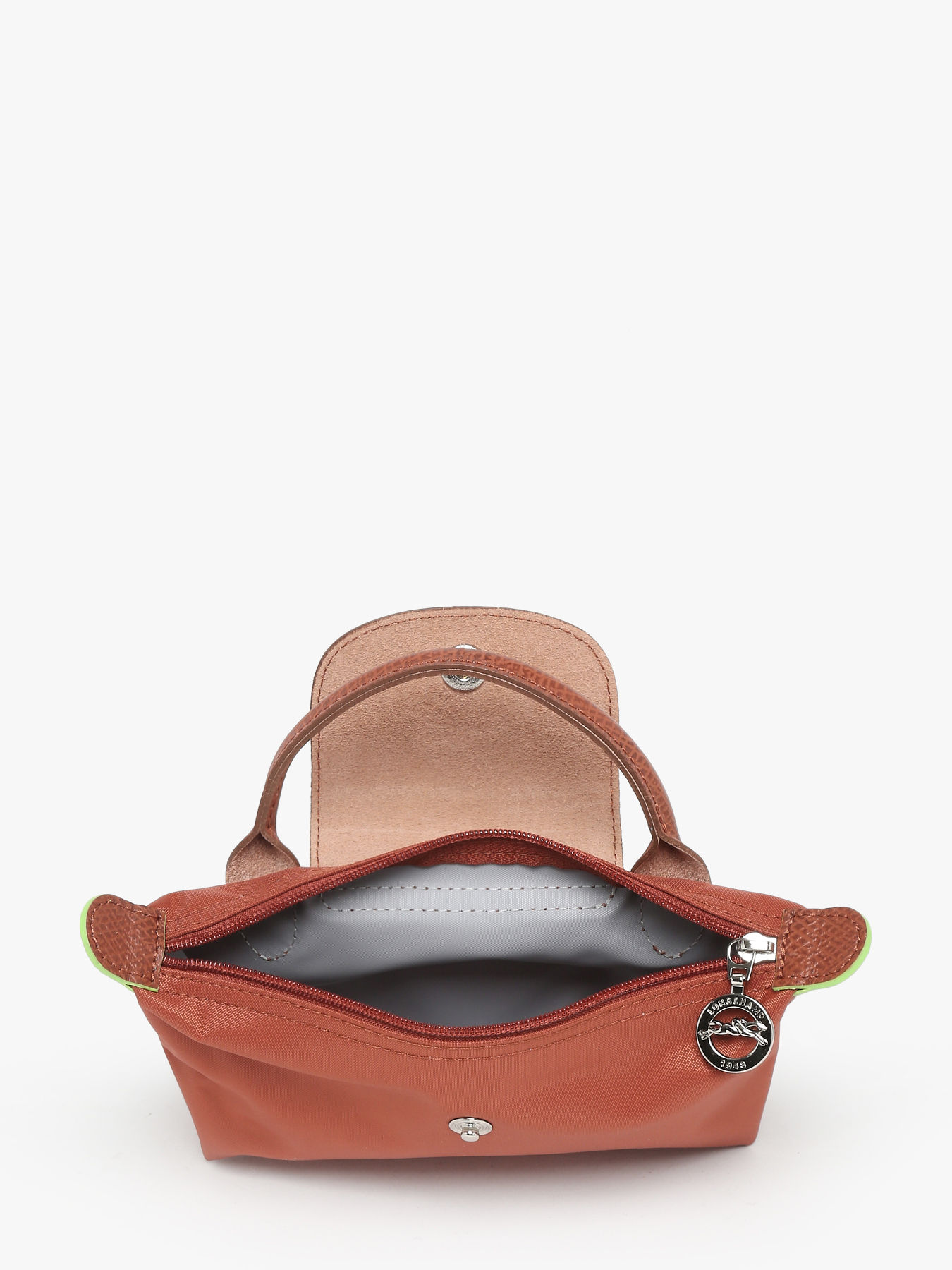 Dit tasje met handvat kan men perfect gebruiken als make-uptasje, maar kan men even goed als extra tasje in de handtas gebruiken om persoonlijke spullen in te organiseren. Men kan het sluiten met rits en bevat daarnaast ook een overslag klep in het typische Russisch leder. De felgroene accenten op de oren van deze etui verwijzen deels naar de heldergroene kleur dat het merk weergspiegelt. Deze staat symbool voor zijn frisheid en dynamiek. Het kleur staat daarnaast ook symbool voor hun duurzaamheid. Zo is de volledige lijn geproduceerd uit gerecycled nylon.
