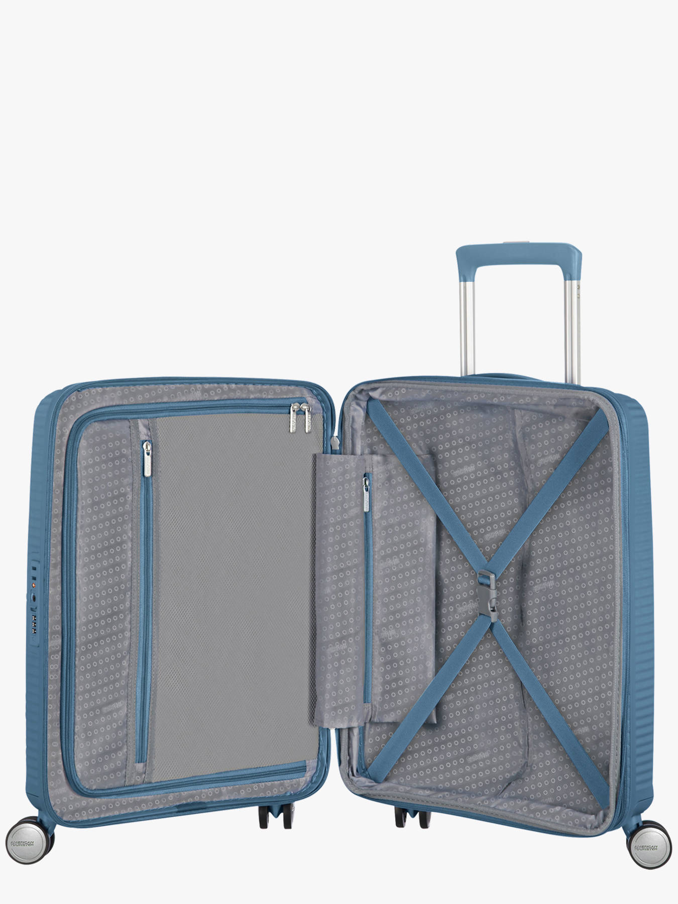 Koffer uit de Soundbox-lijn van American Tourister. De koffer van Cristiano Ronaldo. Ideaal formaat voor een weekendje weg of als handbagage. Binnenin is de koffer opgesplitst in twee compartimenten met riemen aan elke kant. Heel stevig en licht, vervaardigd van polypropyleen. Geniet van een maximum aan mobiliteit en comfort dankzij de vier dubbele wieltjes, de twee draaggrepen en het regelbare trolleysysteem. Veilig door het cijferslot systeem. Ook uitgerust met een TSA systeem conform de Amerikaanse wetgeving.