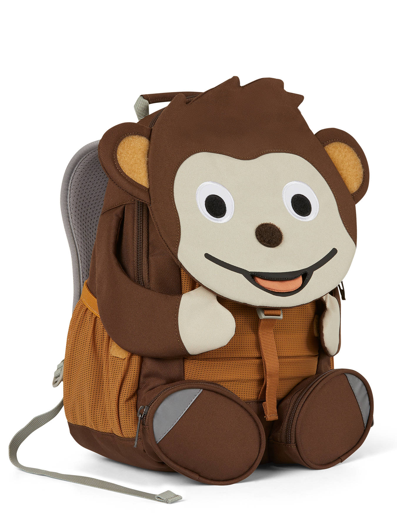Maak kennis met dit toffe rugzakje van het Duitse merk Affenzahn, de nieuwe beste vriend van uw kleuter! De rugzak is gemaakt uit stevig en waterafstotend materiaal, en heeft tal van voordelen! De pootjes van het diertje hebben een velctro patch, die aan de neus, ogen en oortjes kunnen bevestigd worden. Laten we verstoppertje spelen! Ook de tong is uitrekbaar, en onthult een handig naamlabel. Het hoofdcompartiment van dit rugzakje sluit met rits, en kan makkelijk een schriftje of lunchbox bevatten. Vooraan en aan weerszijden zijn extra vakjes uit mesh voorzien, om kleine spulletjes in te stoppen. Ook de pootjes onthullen twee kleine ritsvakjes! De verstelbare schouderbandjes en rugzijde zijn gewatteerd, voor optimaal draagcomfort. De rugzak is ook voorzien van reflectoren, zodat uw kleuter zich veilig in het verkeer kan begeven. Ook perfect als lunchtas!