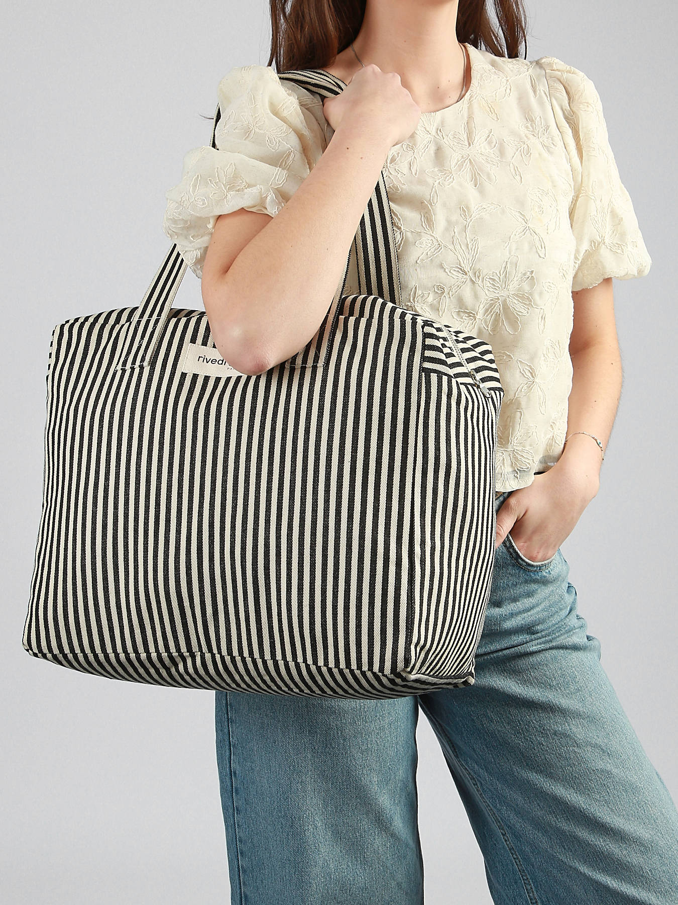 De schoudertas SPRING STRIPED RIVEDROITE, in gerecycleerd katoen, combineert moderne stijl en respect voor het milieu. De buitenkant is voorzien van een veilige ritssluiting en een handgreep van 30 cm, wat zorgt voor comfortabel dragen op de schouder gedurende de hele dag. Binnenin zorgt een ritsvak ervoor dat u uw essentials zoals telefoon, portefeuille of kleine accessoires op een georganiseerde en veilige manier kunt opbergen. Deze tas is ruim genoeg om een A4-document te bevatten, waardoor hij praktisch en elegant is voor dagelijks gebruik of werk. Licht, functioneel en verfijnd onderscheidt de SPRING STRIPED RIVEDROITE tas zich door zijn strak design en duurzame materialen, en voegt hij een chique en verantwoorde touch toe aan uw outfits. Ideaal voor wie op zoek is naar een elegante, praktische en ecologische tas, vormt hij een veelzijdig en onmisbaar accessoire voor alle gelegenheden.