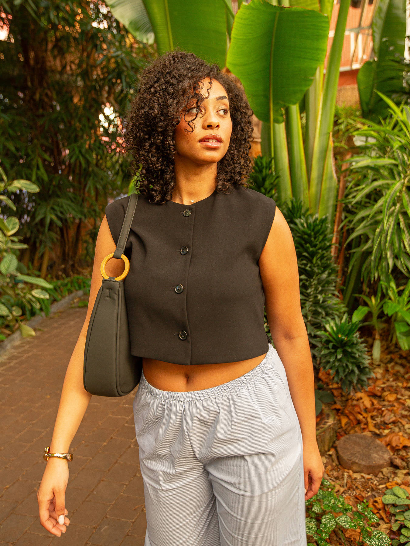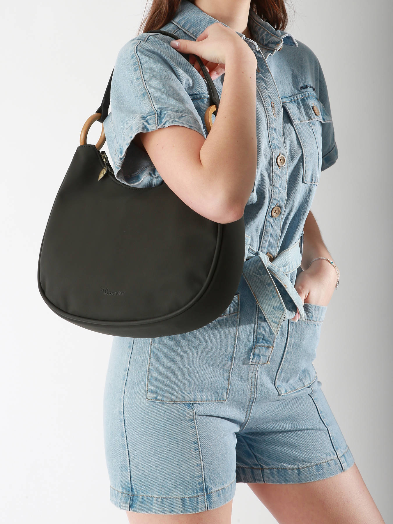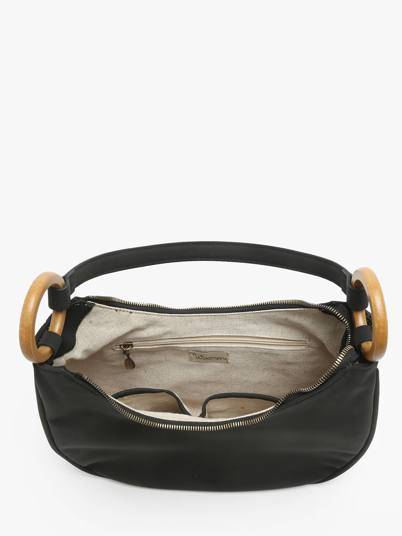 De WOOMEN schoudertas uit de CROCUS-lijn, gemaakt van gerecycled polyurethaan met een voering van katoen en linnen, wordt gesloten met een rits. De tas kan over de schouder of in de hand gedragen worden en heeft twee eenvoudige zakken, een ritszak en een zak aan de achterkant.U kunt de afneembare beige schouderriem met het Woomen-print vasthouden aan de houten ringen aan elke kant van de handgreep voor een praktische en elegante draagwijze.
