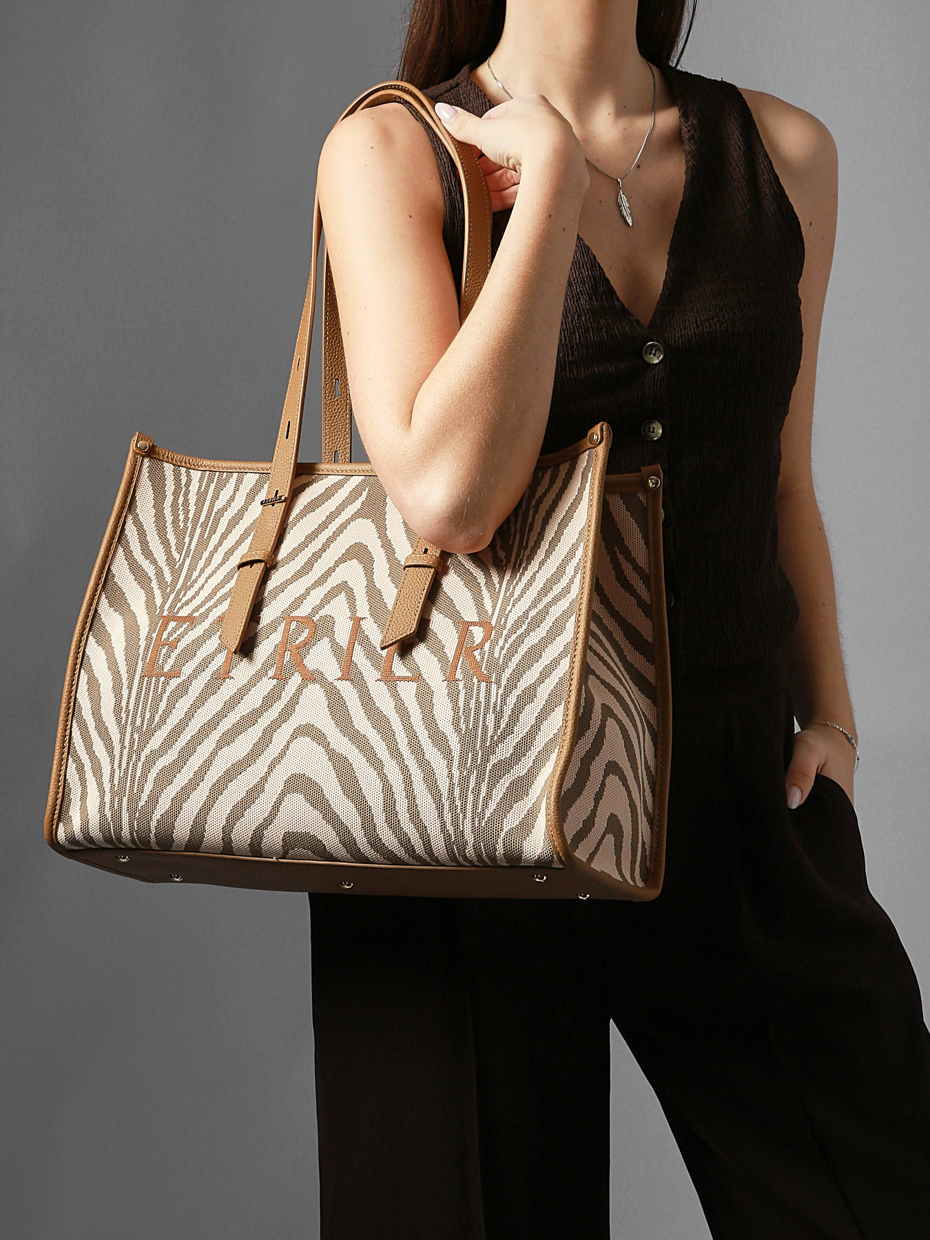 De schoudertas SAFARI van ETRIER herinterpreteert de iconische shopper in een gedurfde en uitgesproken modieuze versie. Gemaakt van textiel met leren afwerkingen, valt hij op door zijn grafische dierenprints die een sterke en hedendaagse stijl uitstralen. Ruim en functioneel, is het L-formaat ideaal om je zomerse dagen te begeleiden, zowel in de stad als tijdens uitstapjes. De hengsels van 28 cm zorgen voor comfortabel schoudergebruik, terwijl de ritssluiting je persoonlijke spullen veilig afsluit. Aan de binnenkant biedt een ritssluitingvak snelle toegang tot je essentials. Een praktische en stijlvolle shopper, ontworpen voor wie elegantie combineert met een wilde geest.